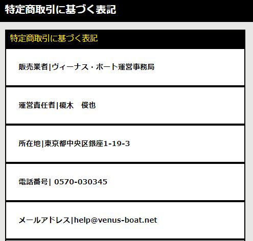 騙されている人がそれだけ多いということか... 運営会社は「VENUS BOAT」事務局で会社情報は掴めなかったのが残念であるが、それは仕方ない。