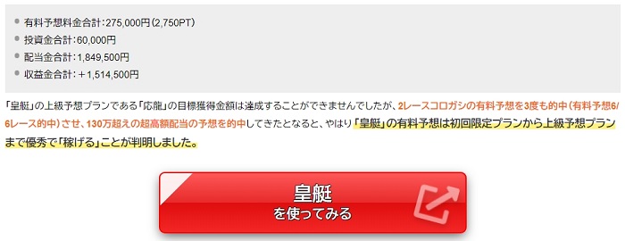 「皇艇」の上級予想プランである「応龍」の目標獲得金額は達成することができませんでしたが、2レースコロガシの有料予想を3度も的中(有料予想6/6レース的中)させ、130万超えの超高額配当の予想を的中してきたとなると、やはり「皇艇」の有料予想は初回限定プランから上級予想プランまで優秀で「稼げる」ことが判明しました。