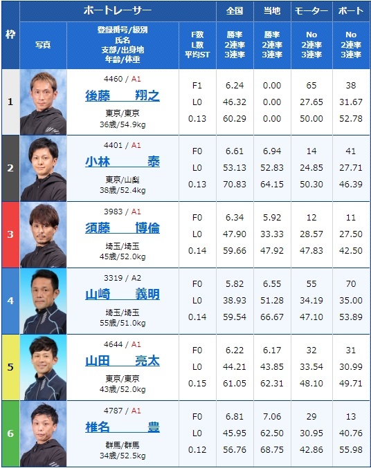 オールB1選手と決め手に欠けそうなこのレース、1号艇佐藤旭選手は勝率こそメンバー内1位ではあるものの、3走して全て着外と調子が悪そうな印象です。