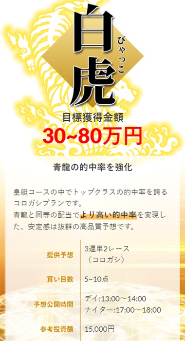 ということでまずは的中率重視で安定感が高いと噂の「白虎」を購入!