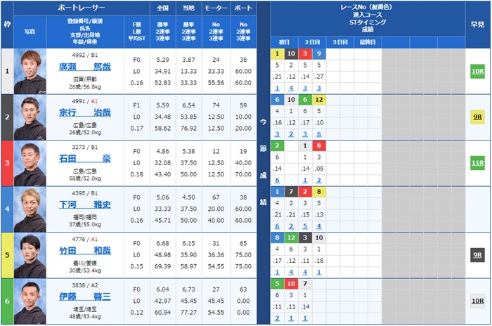 - 【1号艇】:廣瀬 篤哉選手(B1/滋賀)