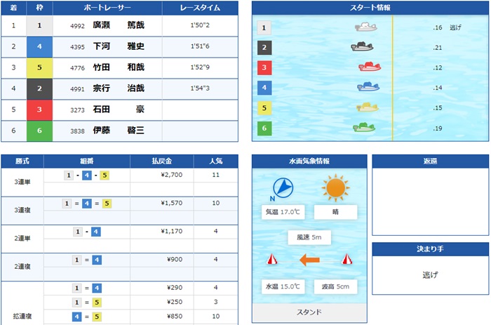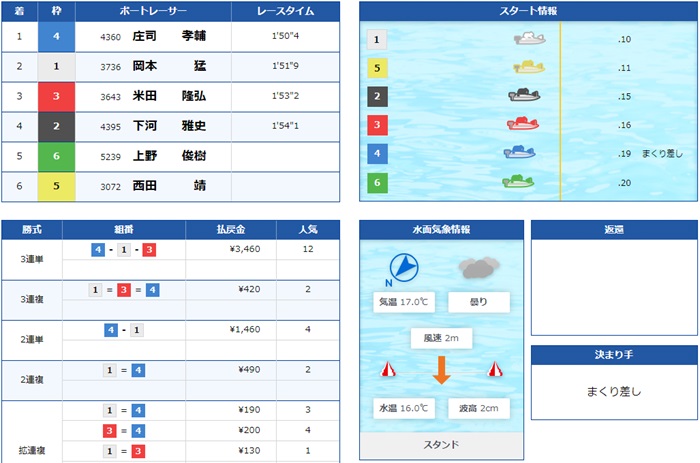 展開を突いた4号艇下河選手が予想通りの2着!