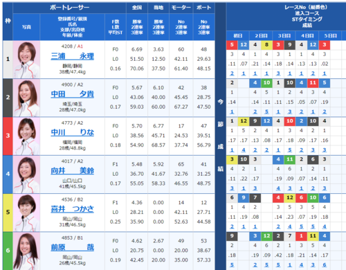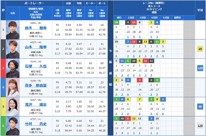 1号艇から3号艇の3選手の勝率が高めでインコース決着になりそうですが、6号艇竹井貴史選手が7レース中5レースで1着とかなり良さそうで、どう絡めて買うかが難しいレースですね。