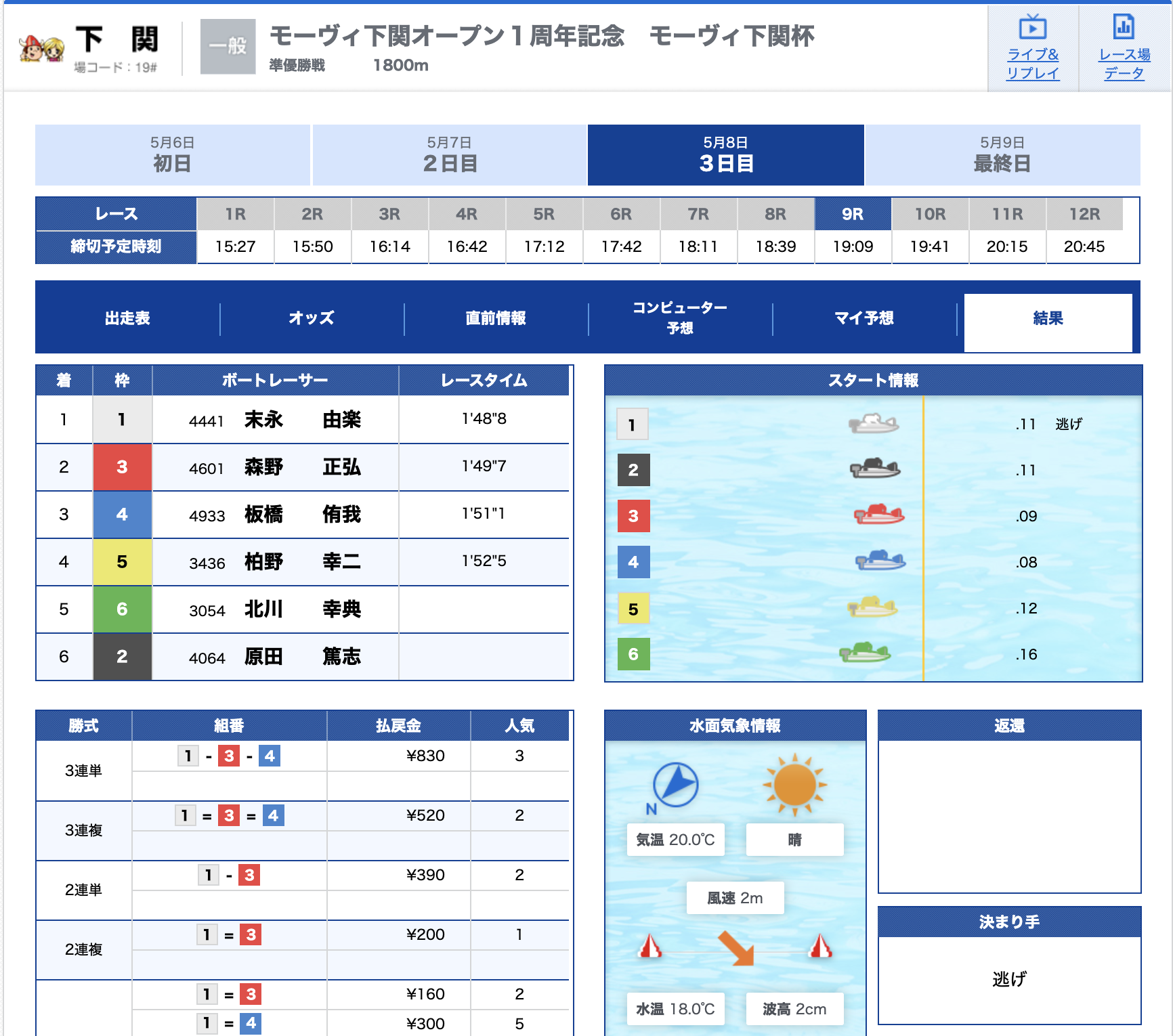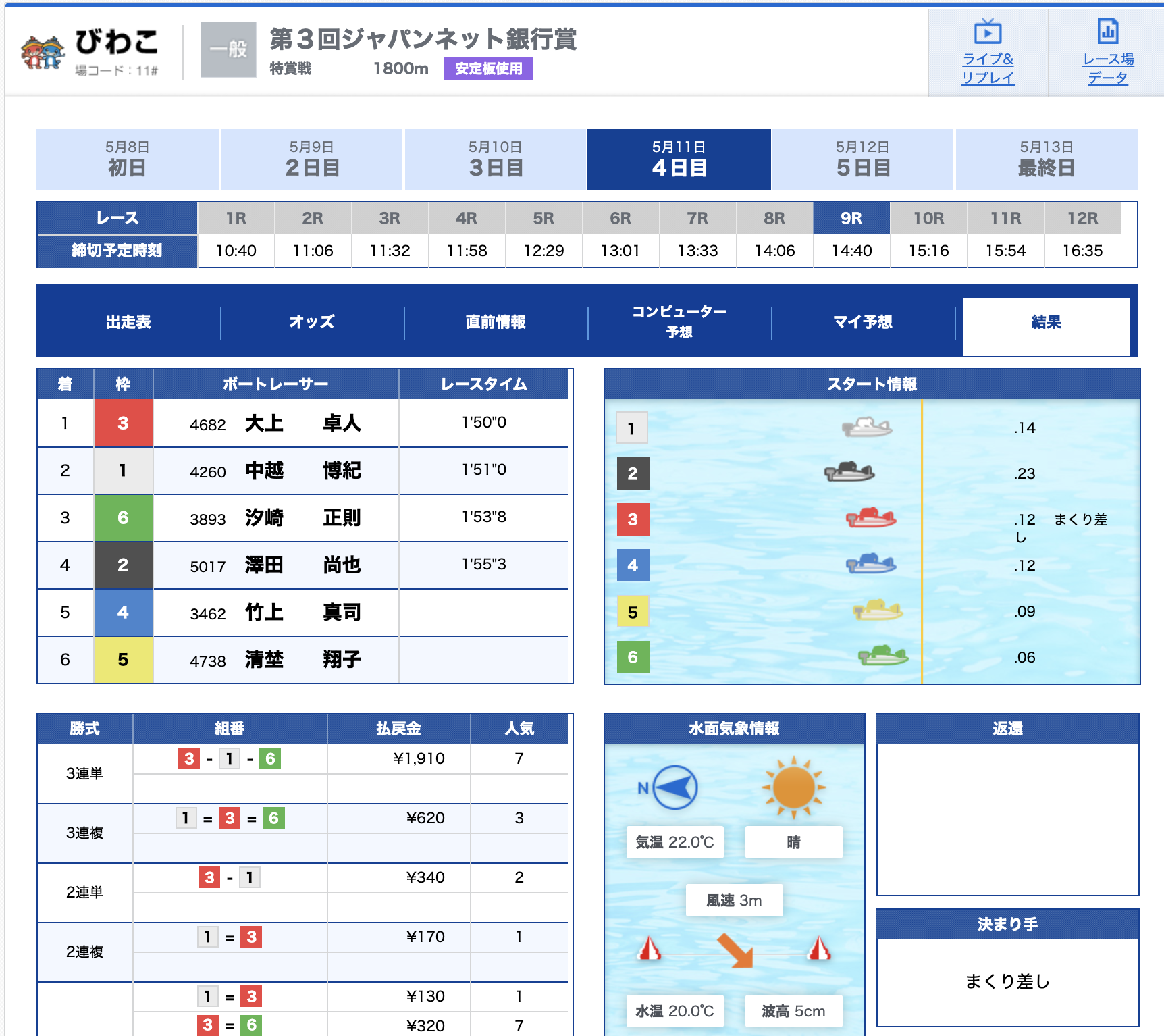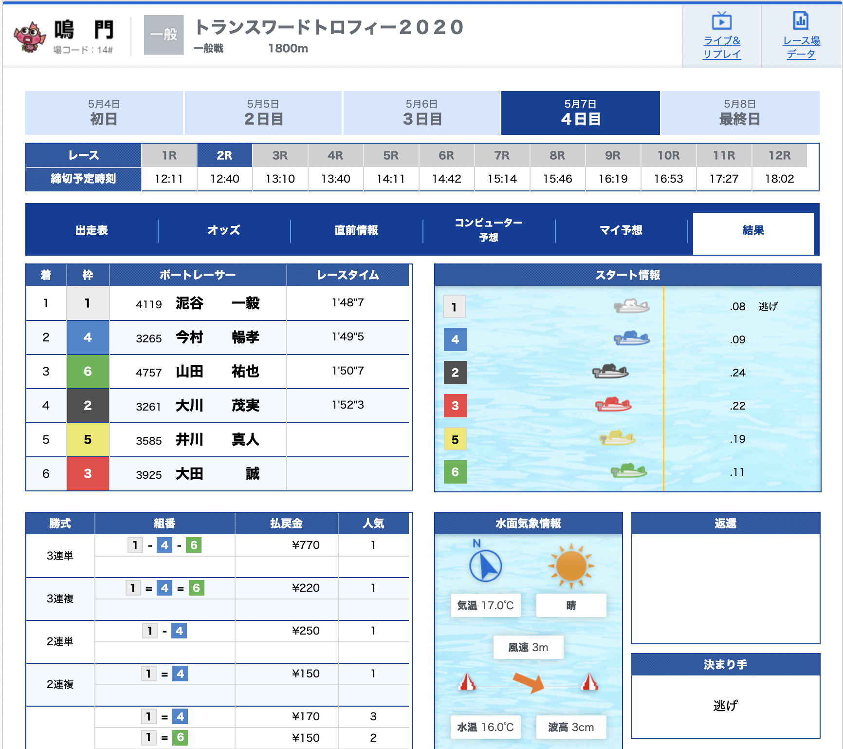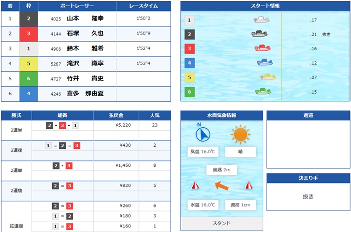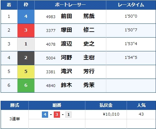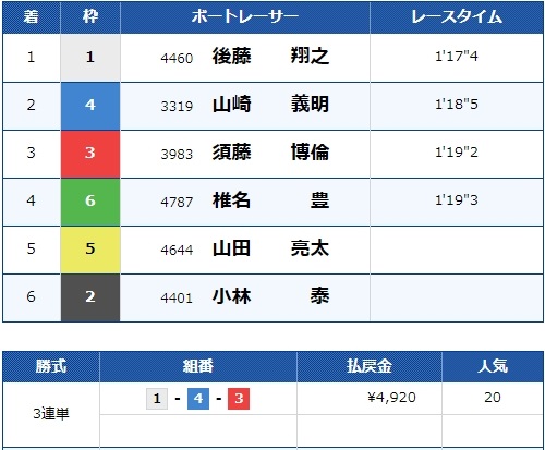 特大万舟かと思いましたが、道中争いでA2の2選手がしっかり逆転、そのまま1号艇鈴木選手も3着の競り合いを制し的中!