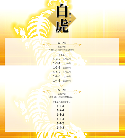 8月29日「白虎」の予想は、芦屋11R→蒲郡3Rの2レースコロガシです。