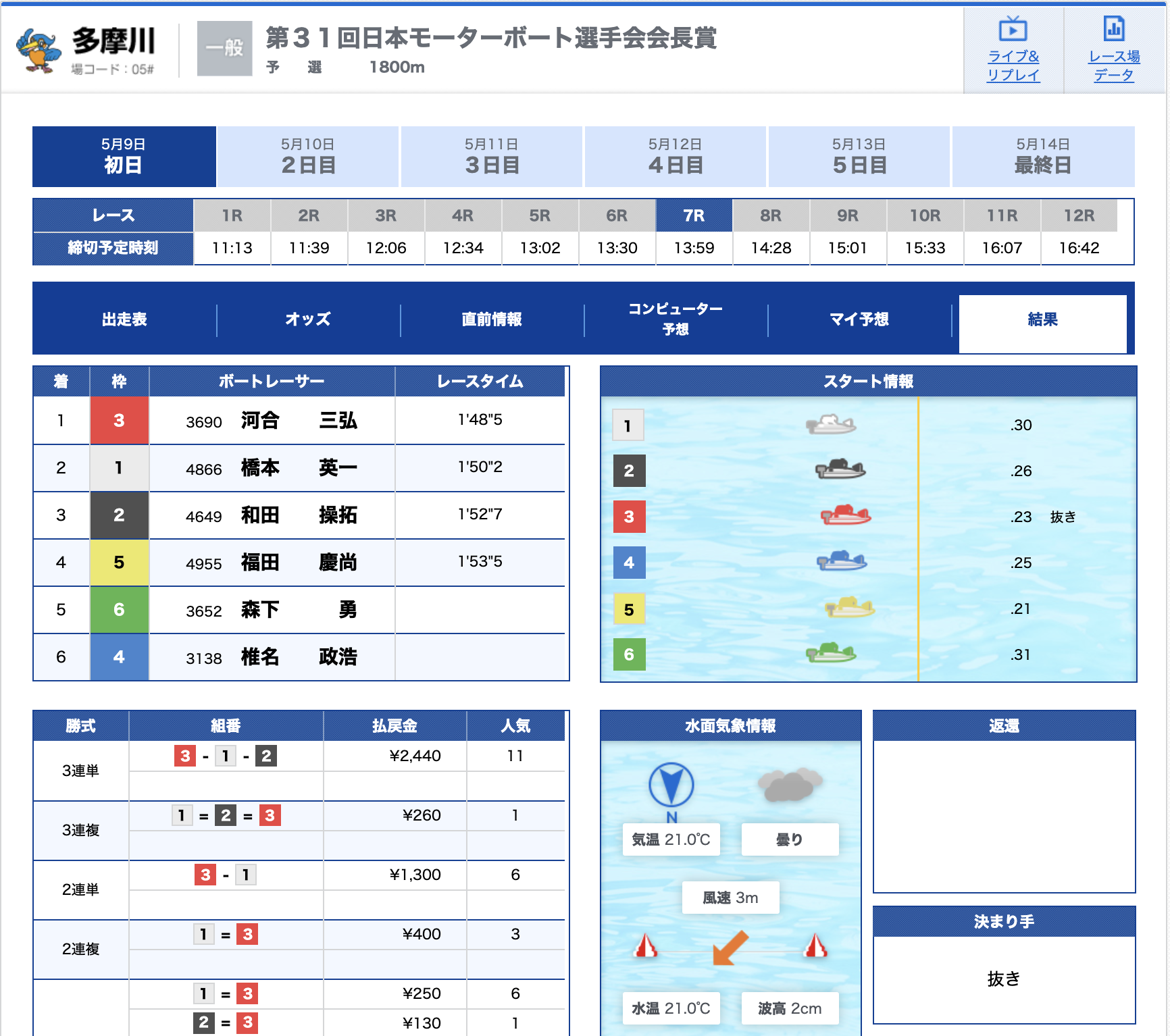 - 【5号艇】:三原 司選手(B1/福岡)