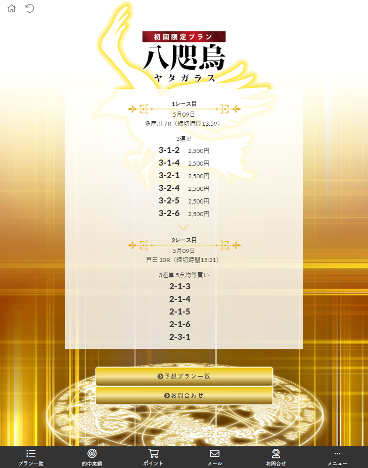 オススメの流れとしては、初回限定プランで不的中の補償も付いている「八咫烏」に挑戦してみて、その的中率の高さや高配当ぶりを実感してみて欲しいです。