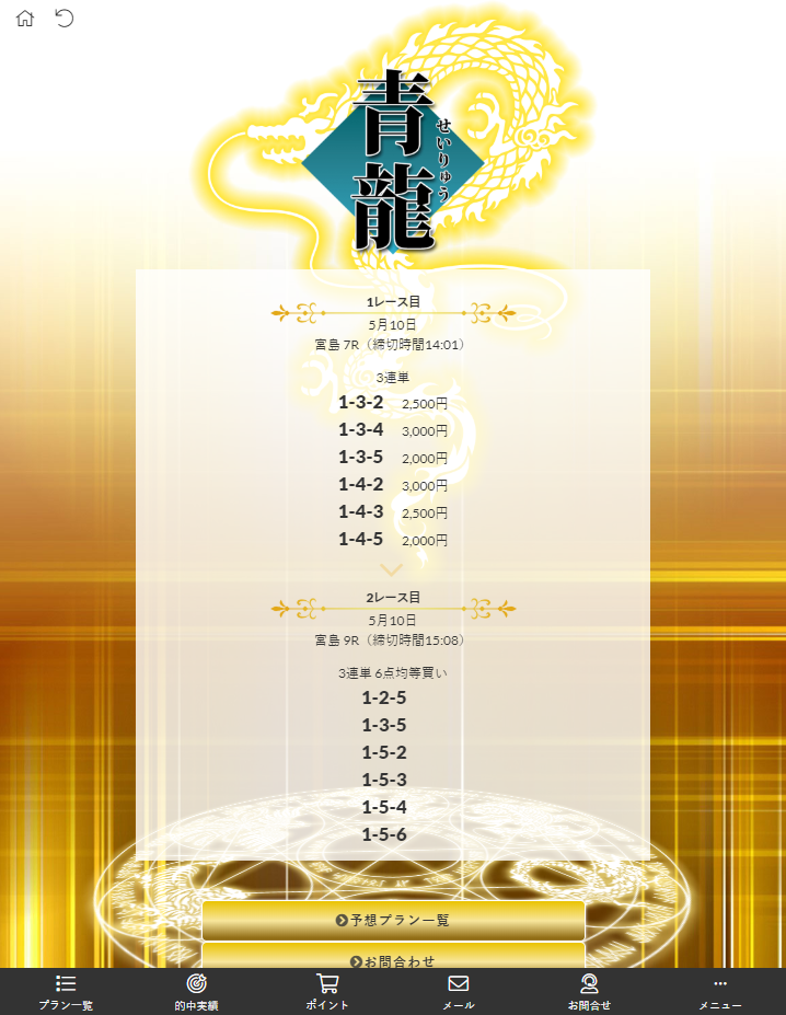 「皇艇」の担当スタッフの方に5月11日のオススメの上級予想プランを聞いてみたところ、「応龍」を勧められました。