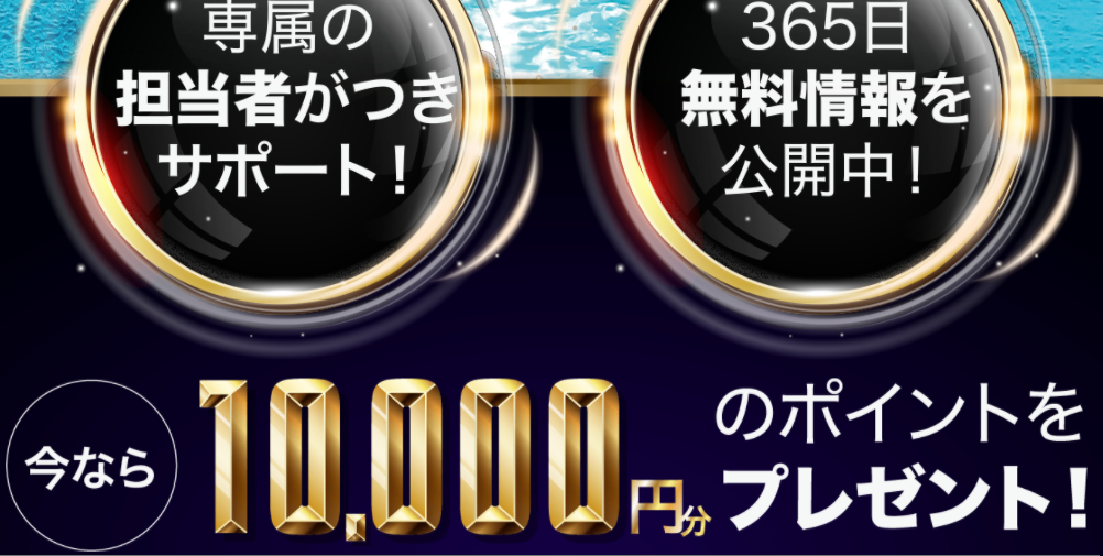 登録の特典は、「無料予想情報365日提供」「専属の担当者がサポート」「10,000分のポイントプレゼント」ということですが、これはかなり良心的のではないでしょうか。