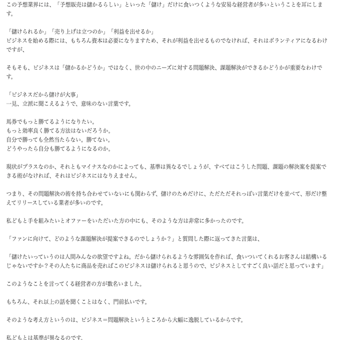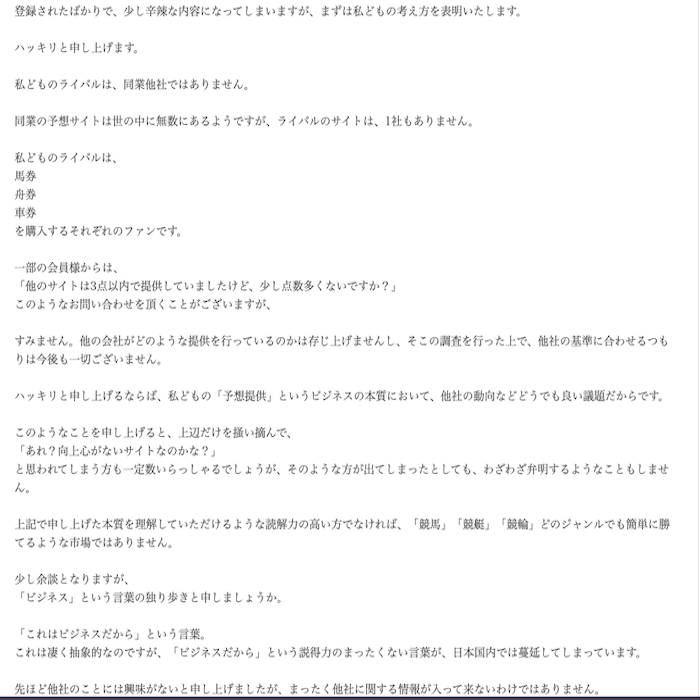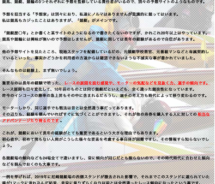 「元々は競艇、競馬、競輪それぞれ専門の予想サイトを作ろうとしていたからちゃんと専門家が揃ってますよ!」 というアピールなのかもしれませんが、管轄官庁も違えば(競艇は国土交通省、競馬は農林水産省、競輪は経済産業省)ルールも情報収集の手段も全く違う競艇、競馬、競輪の予想サイトを3つ同時に運営しようとしていたというのがそもそも無茶な話のように思えます。
