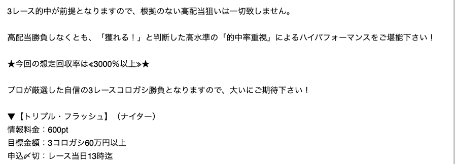 「トリプル・フラッシュ」に至ってはどんなプランなのか説明するページすら作られておらず、会員登録の数日後に送られてきた競艇運営事業部からの挨拶メールで「万舟狙いのプランや3レースのコロガシなどの特別なプランの募集が行われることもございますので、是非ともご堪能ください」と軽く触れた後に「明日ナイターでトリプル・フラッシュ配信決定!」といきなり案内がくるのみです。