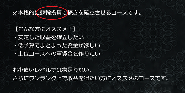 | プラン名 | 提供レース数 | 提供券種 | 投資金額 | 消費ポイント | 推定利益 |