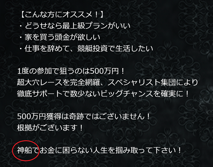 「競艇投資における神となるべく徹底した舟券策略が練られている」とのこと。