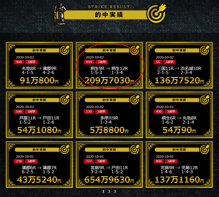 | GOD | 2レース(コロガシ) | 3連単 | 15,000円 | 500,000円以上 | 不明 |