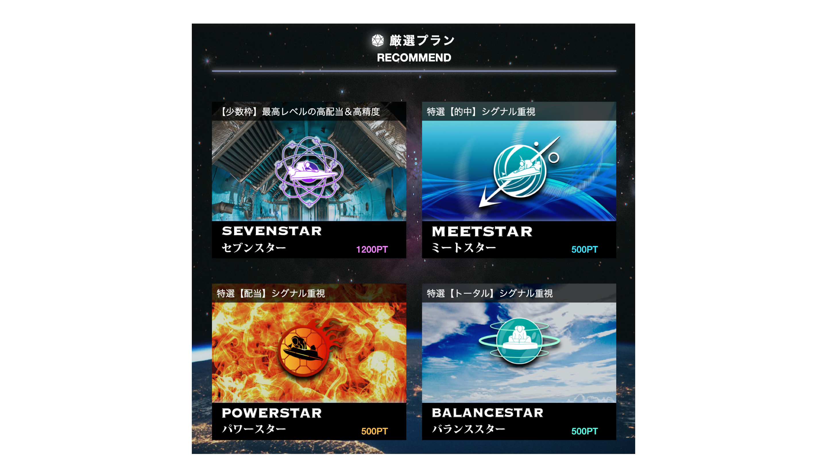 | プラン名 | 提供レース数 | 提供券種 | 投資金額 | 消費ポイント | 推定利益 |