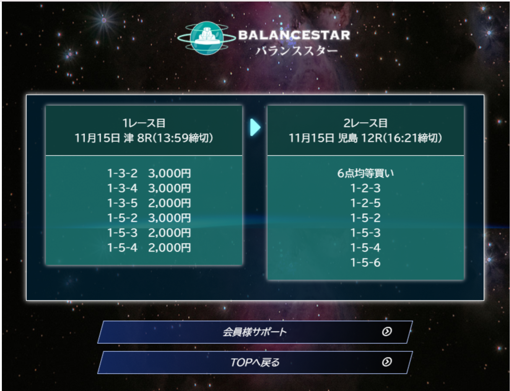 | バランススター | 2レースコロガシ | 3連単 | 15,000円 | 500PT | 40万円〜50万円 |