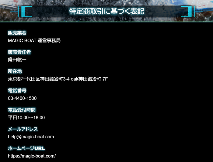 それでは、「MAGIC BOAT」の運営について、特定商取引法に基づく表記から確認してみます。