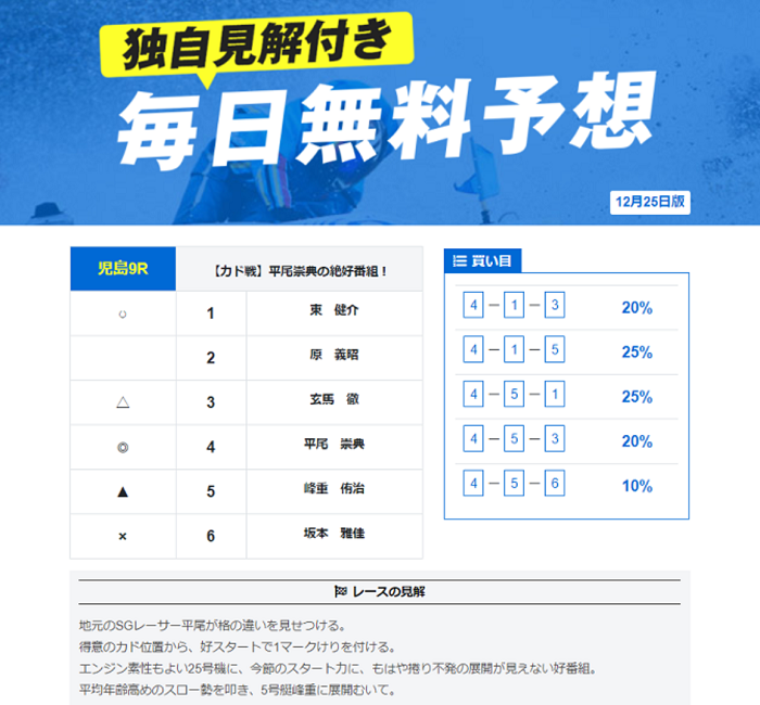 当記事はあくまでも執筆者個人の経験に基づく検証で、当サイトはその正確性・再現性を保証は致しません。競艇予想サイトをご利用の際はご自身の判断でお願いいたします。