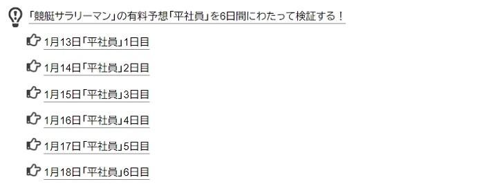 競艇サラリーマンの2万円のコロガシプラン「平社員」を6日間にわたり連続で検証するという内容のものです。