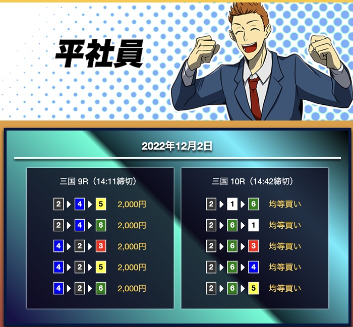 「平社員」は2万円で購入できるプラン、低価格ながら目標金額は15万円で2桁収入を実現できる競艇予想サイト初心者にもオススメなプランとなっているのだとか!