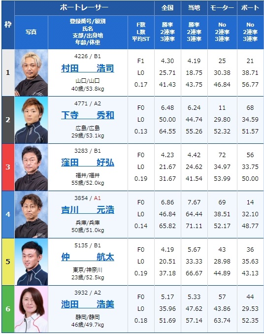 1号艇はB1村田浩司選手、枠は有利ではあるものの、やはり吉川選手などと比べると実力で劣っています。