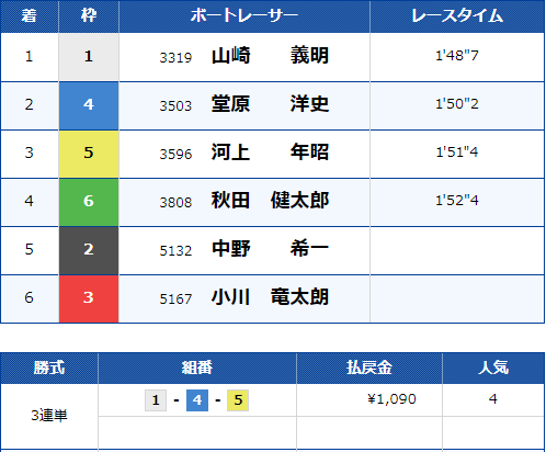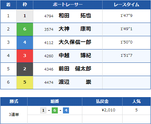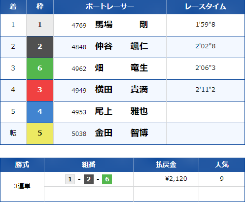 結果は3・6号艇が2マークで流れて、その内を4・5号艇が上手く入る展開になった。