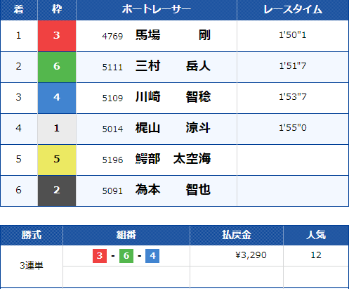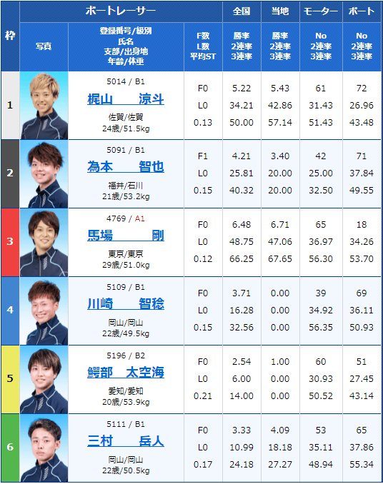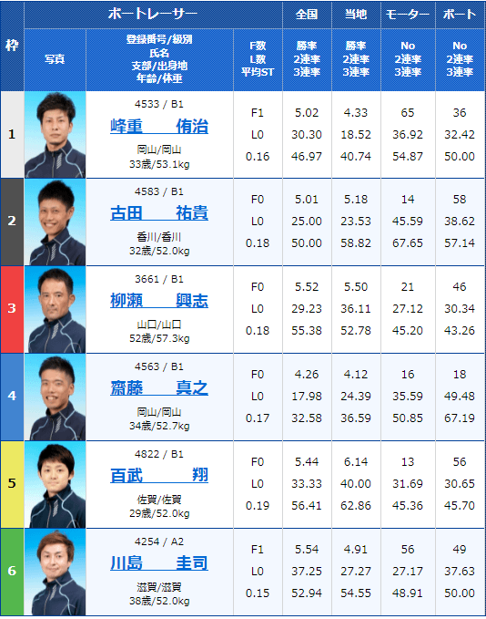 また、1号艇・峰重侑治選手と6号艇・川島圭司選手は休み明け初のレースだ。