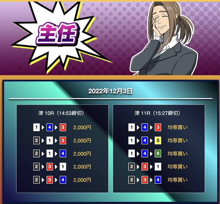 | 部長 | 120万円 | 2レース | 5点 | 1万円 | 1,200pt |