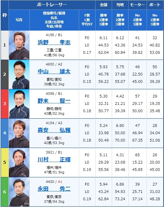 1号艇にはB1ながらも勝率の高い浜野孝志選手が入り、かなりの人気を集めています!