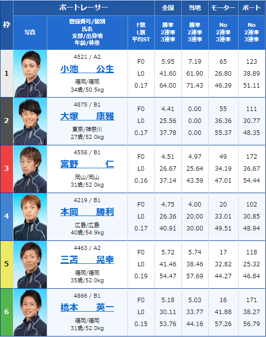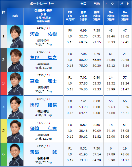 2号艇はA2松尾拓選手、6号艇はなんとA1毒島誠選手でした!