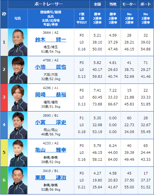 - 【6号艇】:毒島 誠選手(A1/群馬)