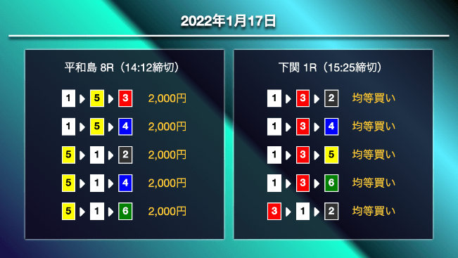 1月17日「平社員」の提供予想は、平和島8R→下関1Rだ。