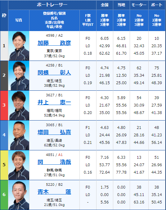 1着・2着に予想しているが、大注目は実力的に上位である1号艇・加藤政彦選手と5号艇・関浩哉選手で、どちらもA級の実力者。
