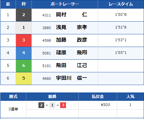 1号艇・浅見宗孝選手も来ると考えているみたいだが、順調にイン戦になるか、インからセンターが混戦で外から5号艇・宇田川信一選手が浮上するという展開も考えてそう。