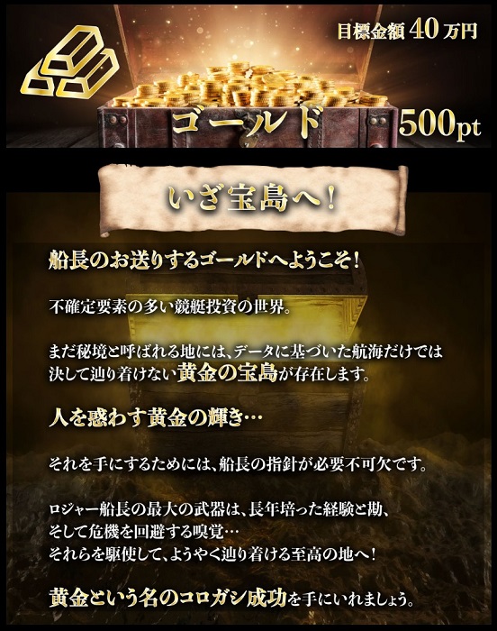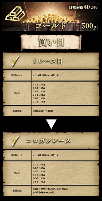 ゴールドは500ポイントで40万円の払戻を狙うプラン、的中率と回収率のバランスが良いらしくまさに王道プランです。