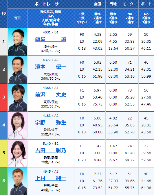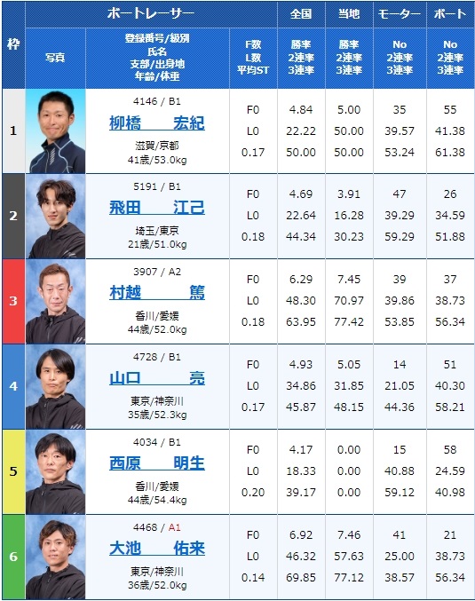 1号艇深川選手はちょっと調子が悪そうですが、このメンバーならさすがに逃げ切りたいところでしょう。