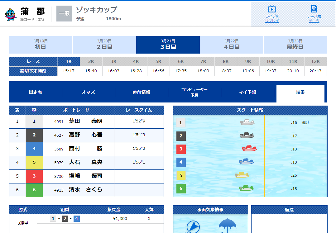 - 【3号艇】:島倉 都選手(B1/群馬)