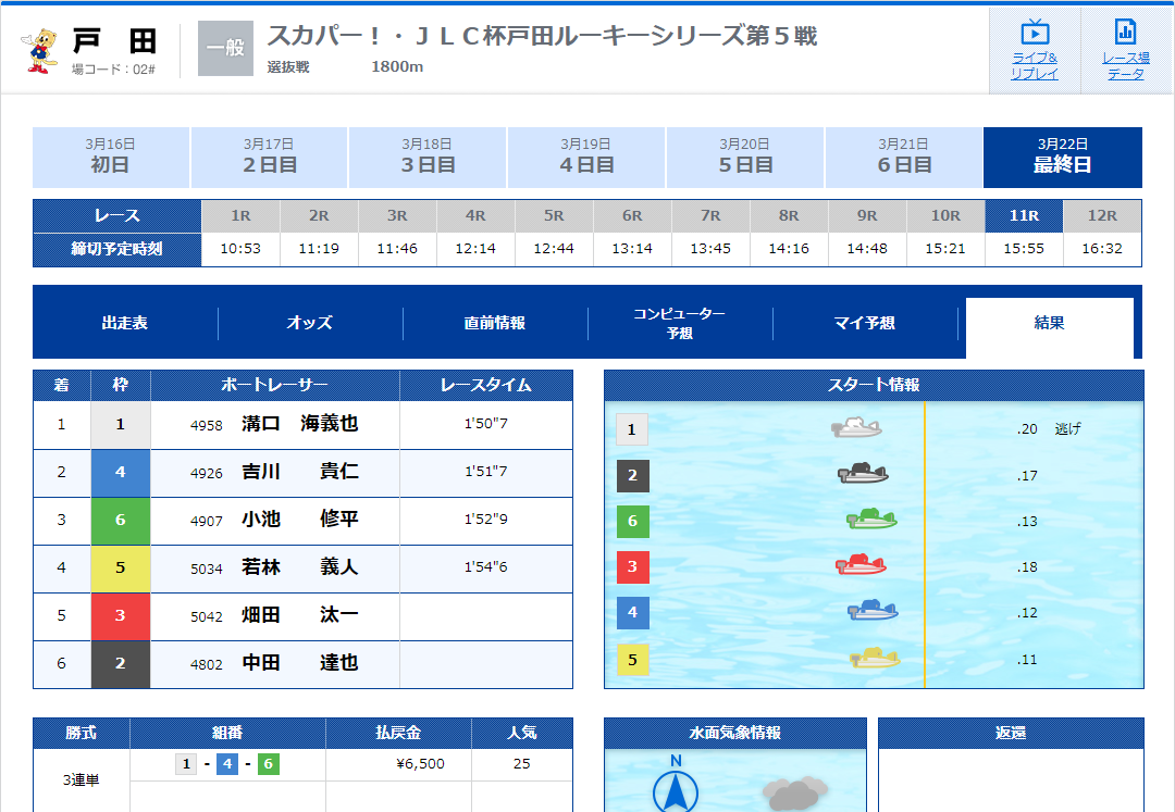 アウトコースの3艇が覗いたスタート、展開をついた5号艇繫野谷選手のまくり差しが決まるかと思われましたが、出足が良かった1号艇鈴木選手がしっかり逃げて的中!