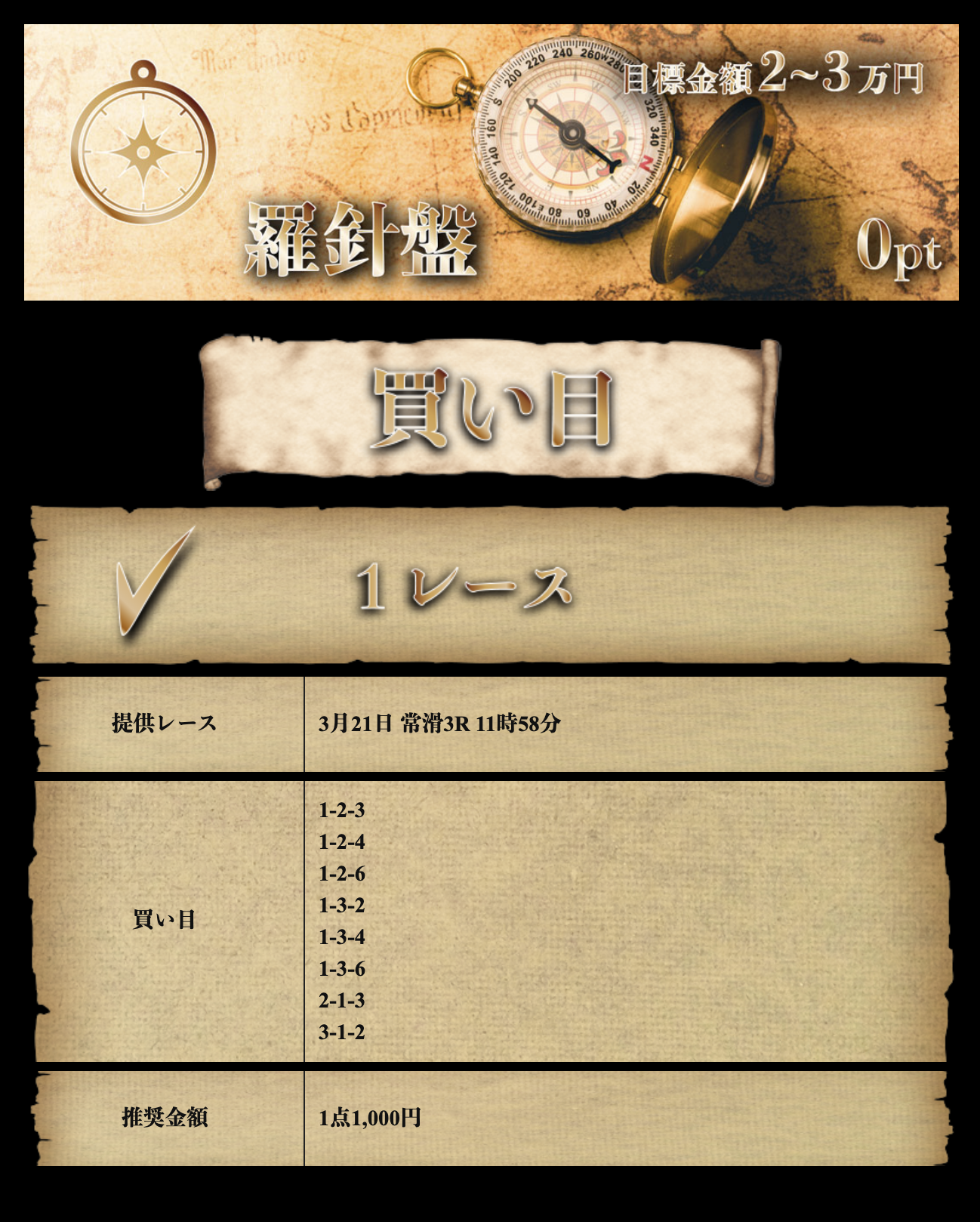 | JOLLYROJER | 2レース | 3連単8点以下 | 1R15,000円 | 3,000pt(300,000円) | 300万円 |