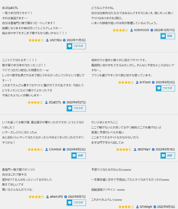 無料予想は的中率が低いが、買い目が8点にもかかわらず、トリガミになっている事が非常に少なく、また的中している日は回収率が大きい日ばかりな事もあり、トリガミにならないようオッズを見て人気な舟券をカバーしつつ、基本穴狙いのようだ。