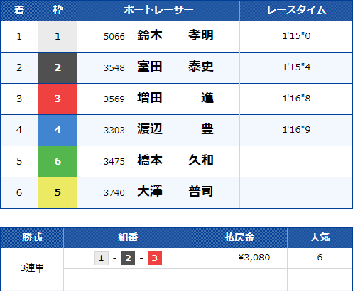 予想は悪くなかったが、4号艇・松本宏貴選手が1マークで2・3号艇を上手くかわし、しっかり波を超えていいターンを出来たのが大きかった。