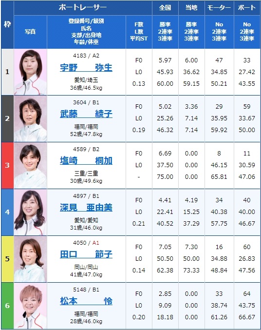 1号艇にはA2宇野弥生選手が入り人気を集めています。