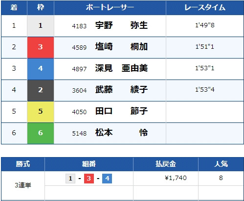 - 【1号艇】:宇野 弥生選手(A2/愛知)