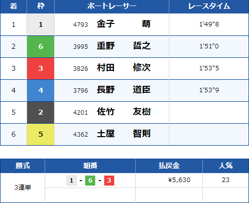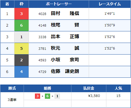 「1-3-5」などはかなりオッズが低く人気通りの予想といえば人気通りですが、3号艇塩崎選手が1着に来ればかなりのオッズが期待できるレースです!