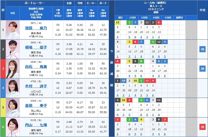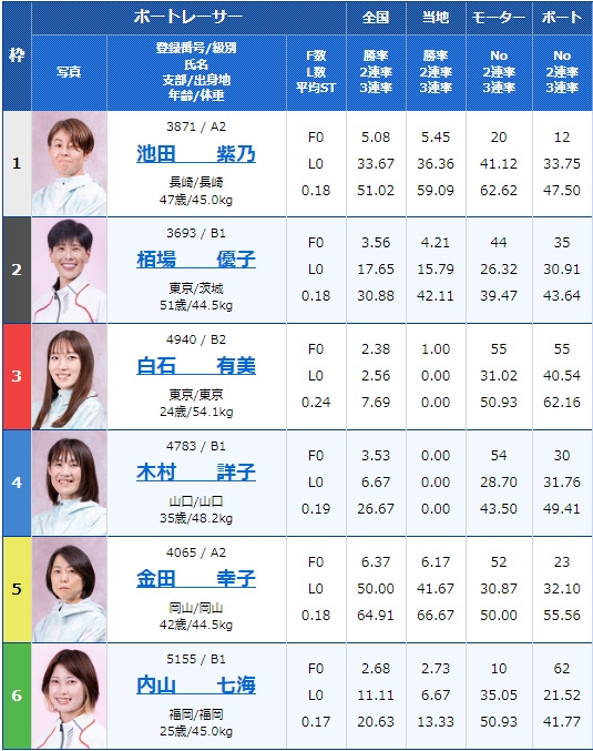 - 【1号艇】:池田 紫乃選手(A2/長崎)
