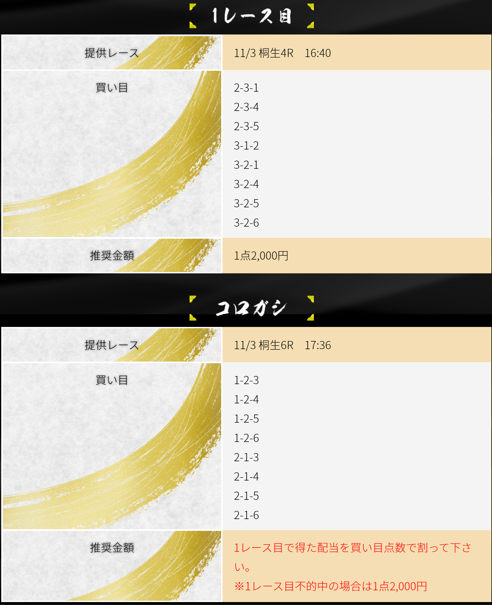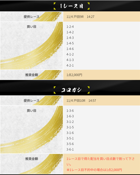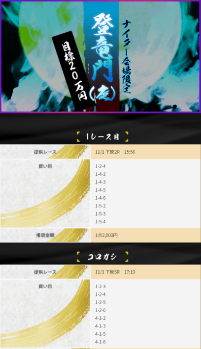 11月5日「登竜門(夜)」の提供された予想は、丸亀3R→丸亀5Rの2レースコロガシとなっていて、提供された買い目は画像の通り。