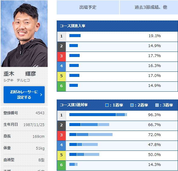 たしかに重木選手は3コースの成績が安定しているイメージで、実際に3コースの3連対率は72%あります。