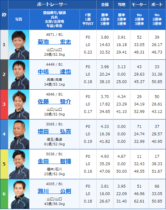 1号艇、6号艇共に実力的にも申し分ないとして、4号艇・福田雅一選手を入れずに、3号艇・野相弘司選手の捲りに期待しているようだ。