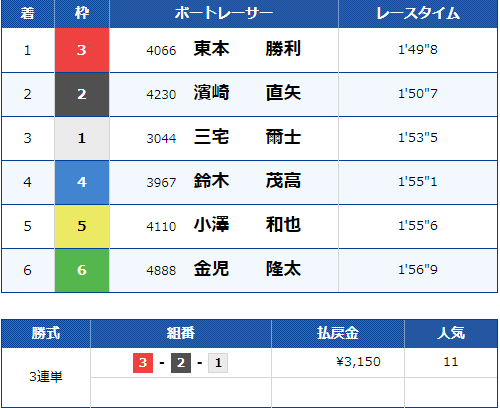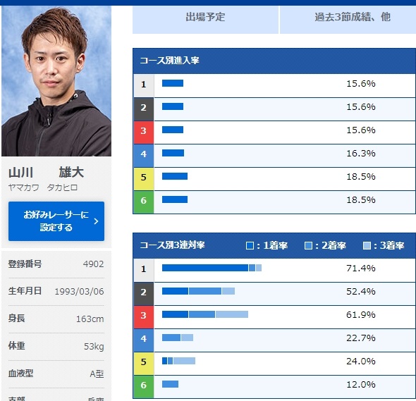 勝率は他の選手より若干劣るものの、今節も調子が良さそうで、3日目にはしっかり1コースから逃げて1着を取っているため、人気が集まるのも納得です!
