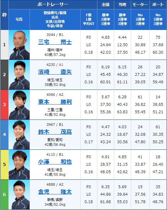 しかし、5号艇金田選手は節間を通して平凡な成績であるため、調子は良さそうには見えません!
